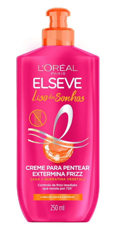 O Creme para pentear Exterminador Frizz desembaraça e combate a umidade para um liso com frizz controlado por até 72h, desde a primeira aplicação. Enriquecido com AHA + QUERATINA VEGETAL, Elseve Liso dos sonhos é o nosso 1º tratamento efeito botox* em casa que transforma os fios para 1 semana de cabelos lisos e à prova de umidade